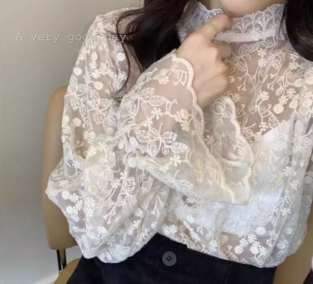 【人気アイテム☆レディース レース トップス】トップス シアートップス レディース ブラウス シャツ レース チュール 花柄 春 夏 秋 冬 長袖 ハイネック インナー フリル袖 重ね着 花柄 透け感 送料無料