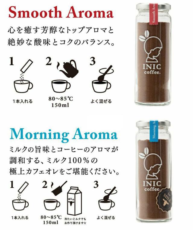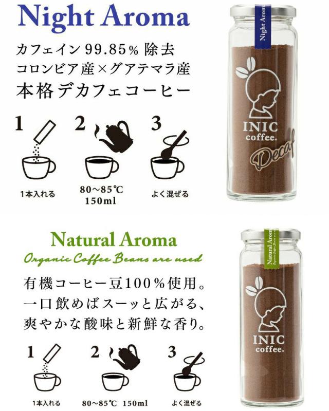 芳醇なアロマが楽しめる「Smooth Aroma」とコク深い濃厚なカフェオレが味わえる「Morning Aroma」、カフェイン99.85%除去した本格デカフェコーヒー「Night Aroma」、爽やかな酸味と新鮮な香りが味わえる「Natural Aroma」。INIC coffeeの人気フレーバーが気分で選べる贅沢なラインナップは、コーヒー好きな方へのギフトに自信を持ってお選びいただけます。