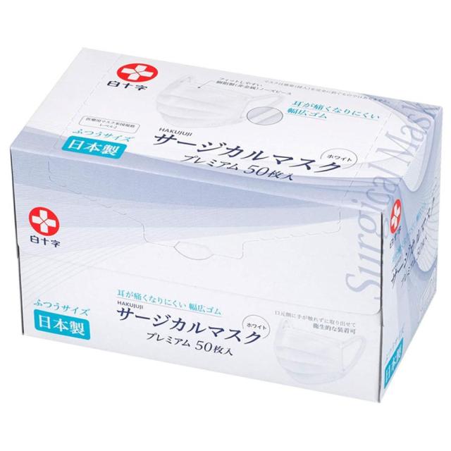 白十字 日本製 サージカルマスクプレミアム ふつうサイズ(50枚入) 耳かけ 幅広ゴム紐タイプ 平ゴム 医療用マスク プリーツ型