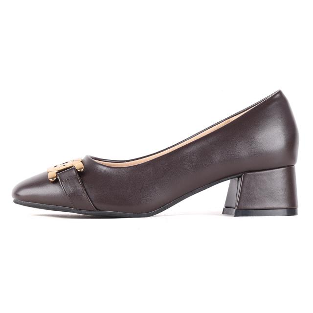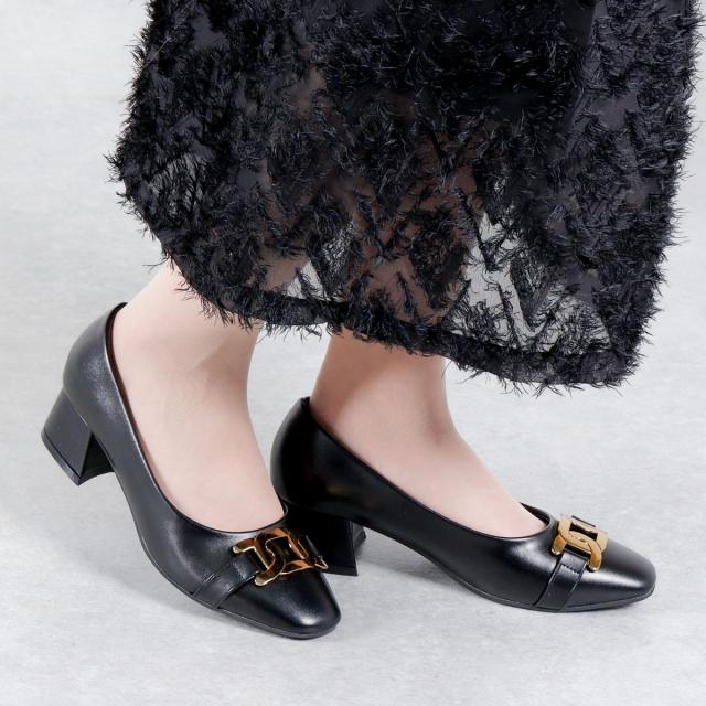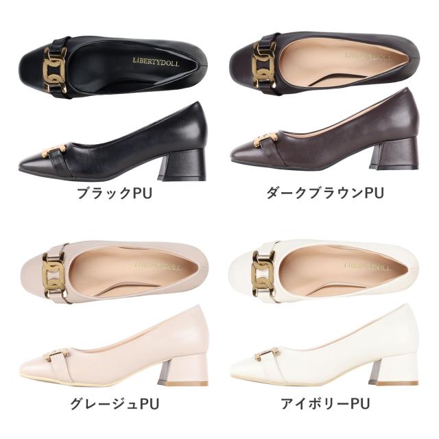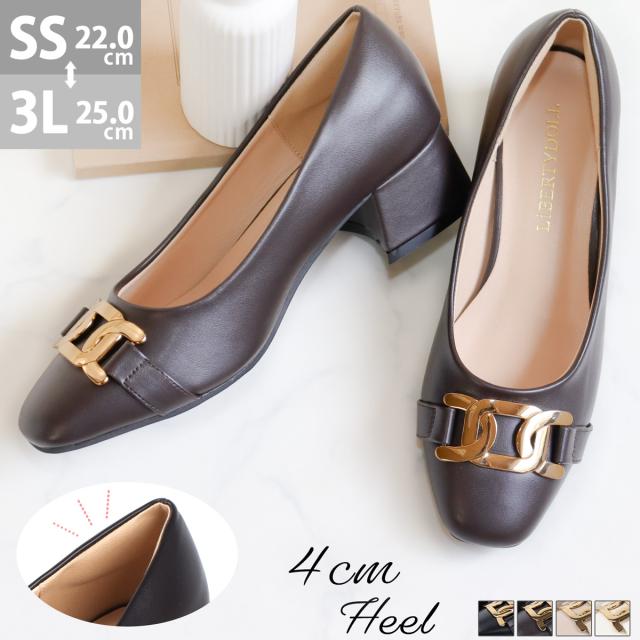 パンプス レディース チャンキーヒール スクエアトゥ 4cmヒール チェーン モチーフ メタル 脱げにくい 合皮 黒 22-25cm リバティードール No.1191