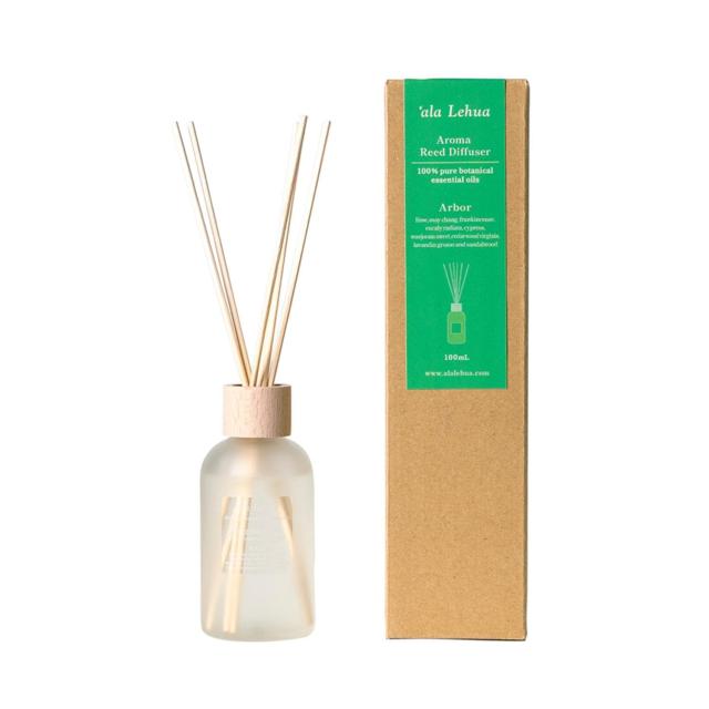 花々や太陽・・・ハワイの自然を想起させる香りが、心地良く広がる♪「ala Lehua アロマリードディフューザー」100mlセット。【ナチュラル感たっぷり】木製キャップとシンプルなデザインに仕上げたボトル。主張を抑えたデザインで空間に馴染みやすく、どんなテイストのお部屋にも素敵にマッチ☆【使い方は簡単】キャップを外した瓶口に木製キャップをセットし、ラタンスティックを挿すだけ。約1〜1.5ヶ月香りが持続し、差し込むスティックの本数で香りの強さを調節可能。(※芳香期間は、気候、温度や湿度、部屋の広さや置き場所によって異なります。)【ハワイを感じる香り】天然精油を100%使用した、ハワイの自然を感じる柔らかな香り。毎日の生活にお気に入りの香りをプラスすることで、疲れた心もリラックス♪【ギフトにもおすすめ】クラフトBOX入りで安心の日本製だから、ちょっとしたギフトにも最適。いつも頑張っている方やお世話になった方へ、香りの贈り物♪【香りのラインナップ】Arbor…ハワイの木陰をイメージした、心地よい光と風を感じるフルーティーグリーンブレンド。昂ぶった心に落ち着きを取り戻し、リフレッシュさせ気持ちを明るく前向きに。Revive…ハワイの輝く太陽をイメージした、心も身体も軽やかになる爽やかなフルーティーブレンド。不安や緊張を和らげ落ち着きを取り戻し、バランスを整えながら気持ちを元気に明るく。Nest…ハワイの森の奥深くに咲く花をイメージした、力強い大地と花の甘さを感じるフローラルウッディブレンド。心に安定感と充足感を取り戻し、気持ちを穏やかに。