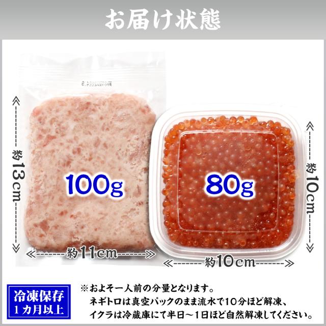 たっぷりと脂がのった新鮮なマグロを厳選し、こだわりの技術でマイルドに加工したネギトロと、オホーツク海で水揚げされた新鮮な鱒を船上で急速冷凍した一級品のイクラをセットにいたしました。自然解凍するだけで手軽に本場の海鮮丼をご堪能できます。
