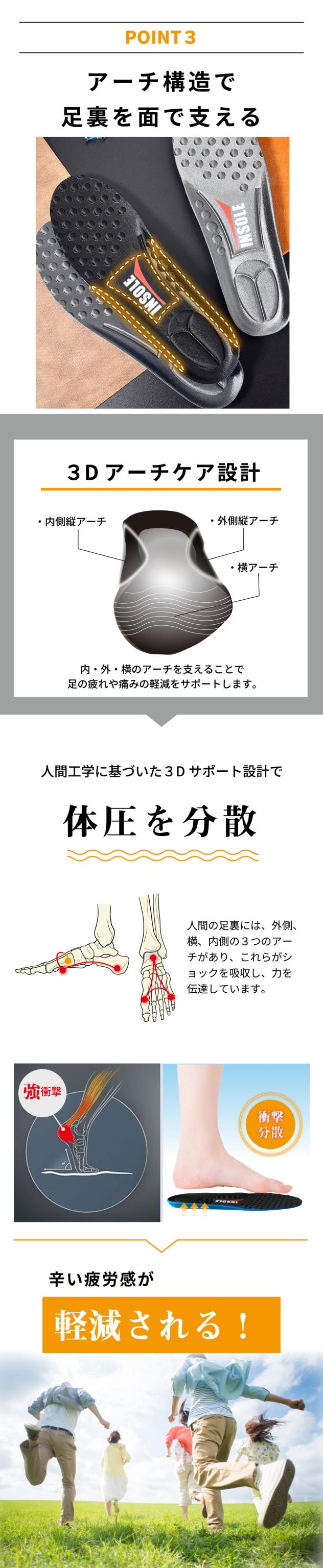 3Dアーチケアクッションが体圧を分散し足の疲れや痛みの軽減