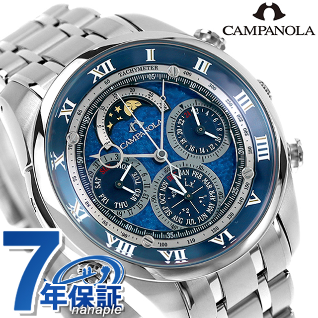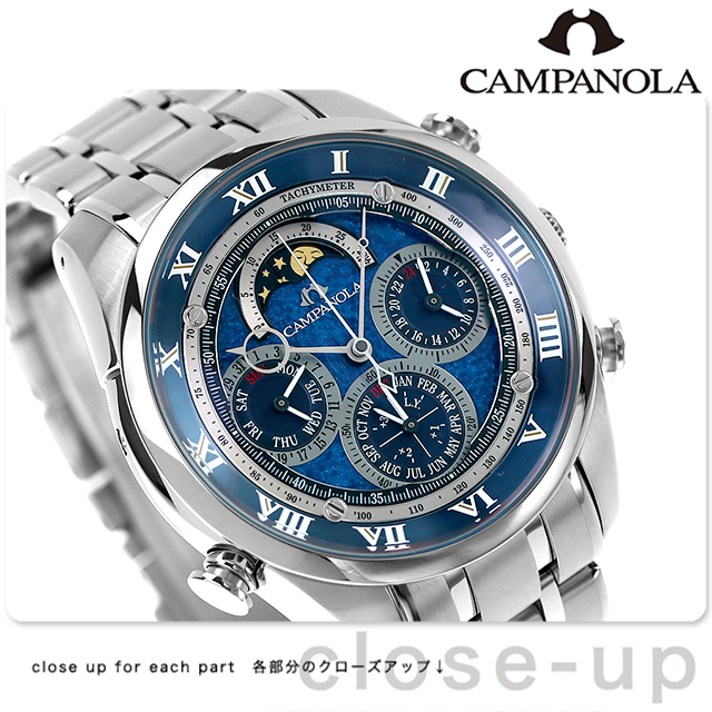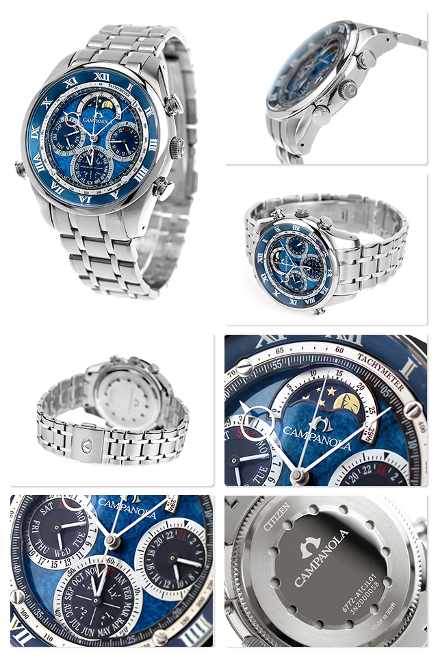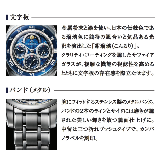 正規品 7年保証キャンペーン 送料無料 シチズン カンパノラ コンプリケーションコレクション グランドコンプリケーション 紺瑠璃 こんるり クロノグラフ ムーンフェイズ 日本製 メンズ 腕時計 AH4080-61L CITIZEN CAMPANOLA COMPLICATION COLLECTION GRAND COMPLICATION アナログ ブルー ◆「宙空の美」を表現し、独創のデザインと機構で「時を愉しむ」ためのウオッチ、CAMPANOLA(カンパノラ)。ムーンフェイズ、クロノグラフ、パーペチュアルカレンダー、ミニッツリピーターを搭載したグランドコンプリケーション・モデル。複雑時計の愉しみを、クオーツウオッチであなたのものに。 文字盤は金属粉末と漆を使い、日本の伝統色である瑠璃色に独特の風合いと気品ある光沢を演出した「紺瑠璃(こんるり)」。クラリティ・コーティングを施したサファイアガラスが、複雑な機能の視認性を高めるとともに文字板の存在感を際立たせます。メタルバンドは2本のラインとサイドには磨きが施された美しい輝きを放つ鏡面仕上げになっています。 発売日:2023年12月発売