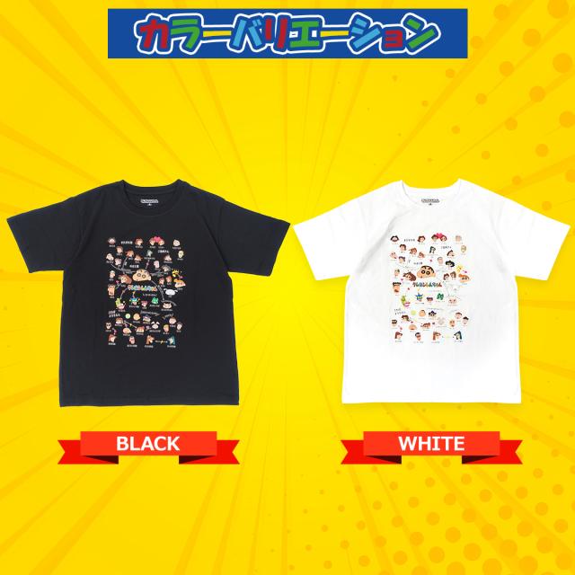 主人公・のはらしんのすけをはじめとした人気キャラクターの相関図がプリントされています。v カラー展開はブラック・ホワイトの2色展開です。