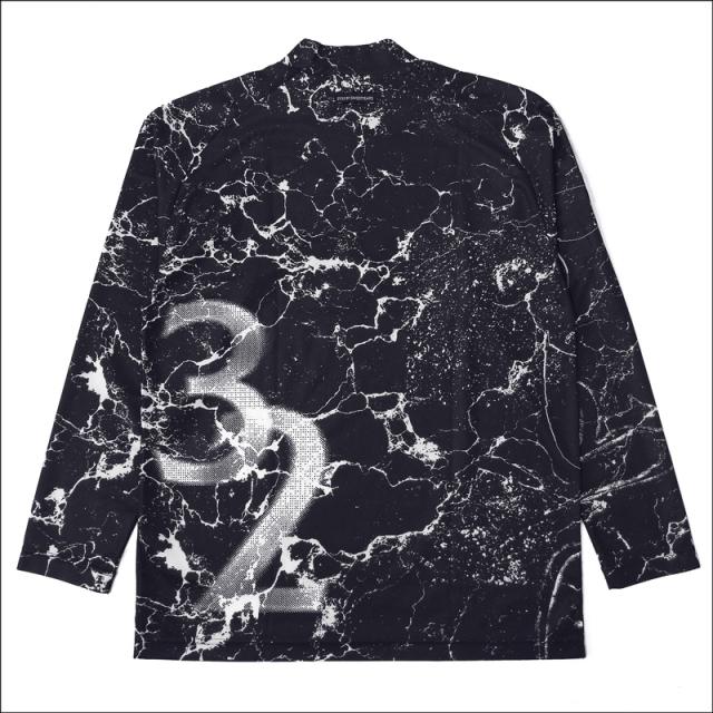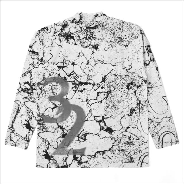 鹿の子素材に総柄の昇華プリントが施された、長袖モックネックシャツ。