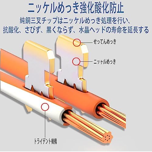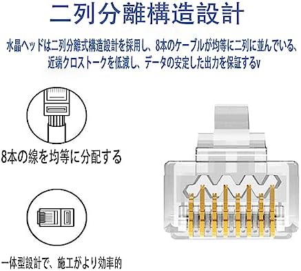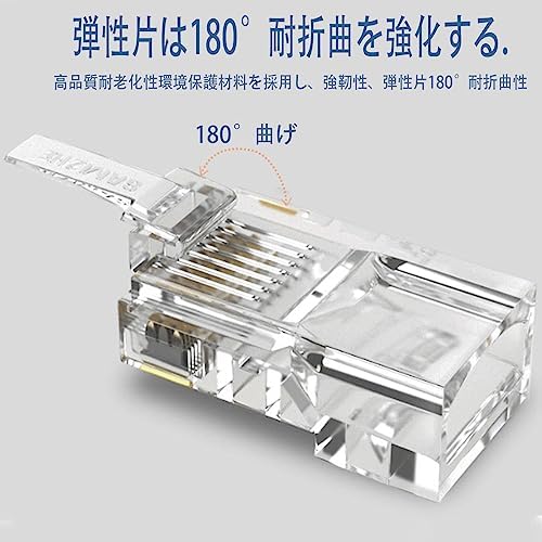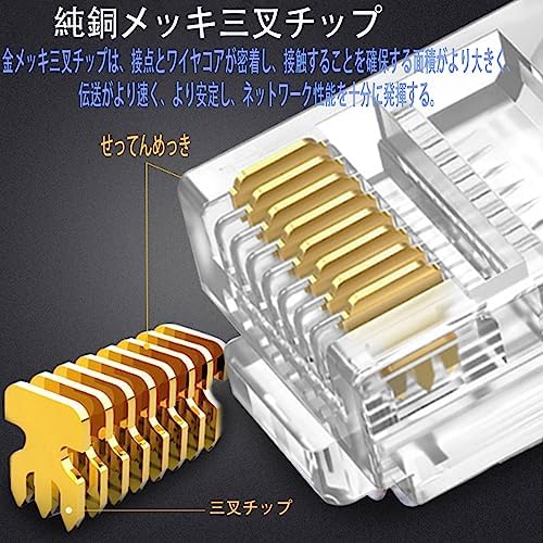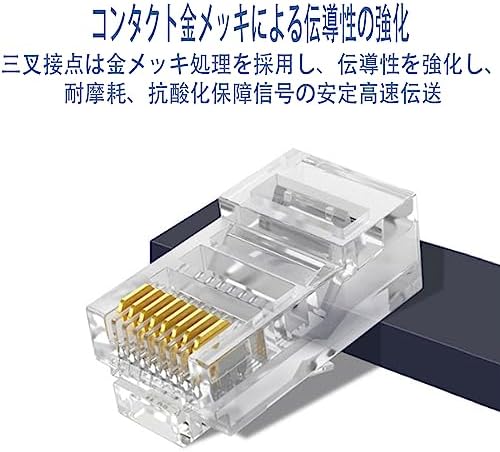 【金メッキ三叉ブレード】金メッキピンを採用しておりますので、信号の減衰に強い、速くて安定的なシングル伝送を提供できる、ギガビットイーサネット定格のネットワークに信頼性の高いパフォーマンスを提供します。8P8Cネットワークコネクタの金メッキ接点は、Cat6ケーブルに優れた伝送性能と耐腐食性を提供します。