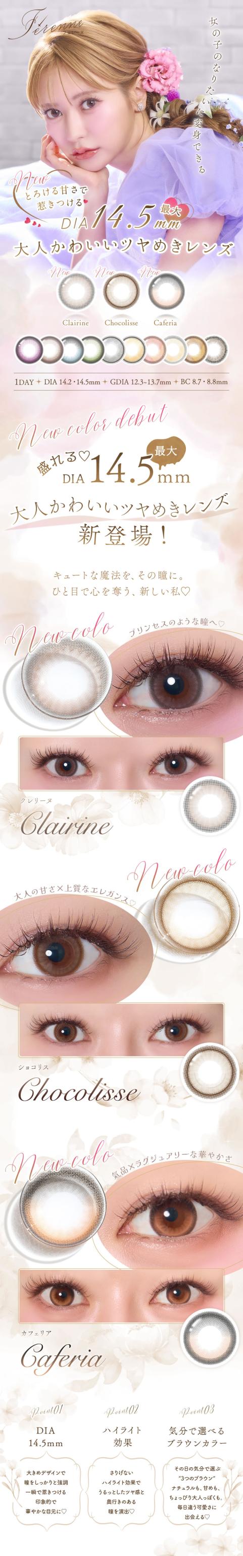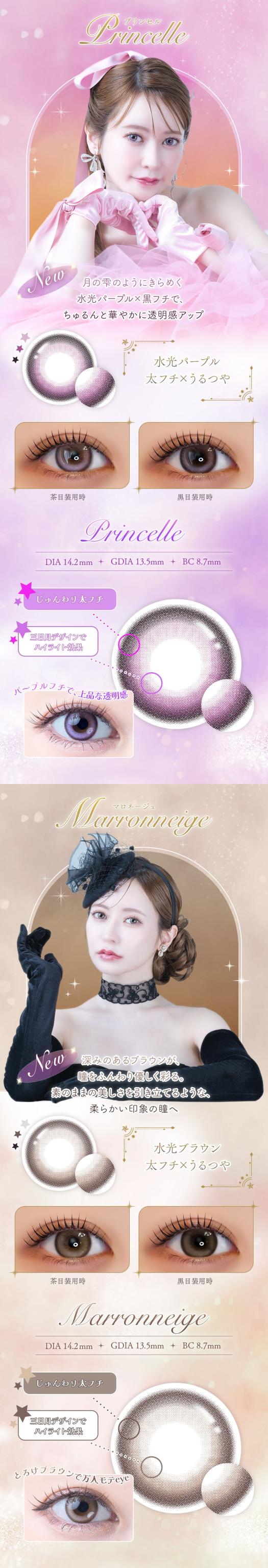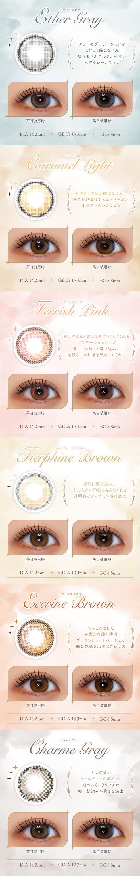 | カラー | プリンセル【1813】 マロネージュ【1814】 ブルーノール【1815】 オリヴィーヌ【1816】 フェリッシュピンク【1436】 ティアフィーヌブラウン【1437】 エクリンブラウン【1438】 シャルムグレー【1439】 キャラメルライト【1642】 エーテルグレー【1643】 |
