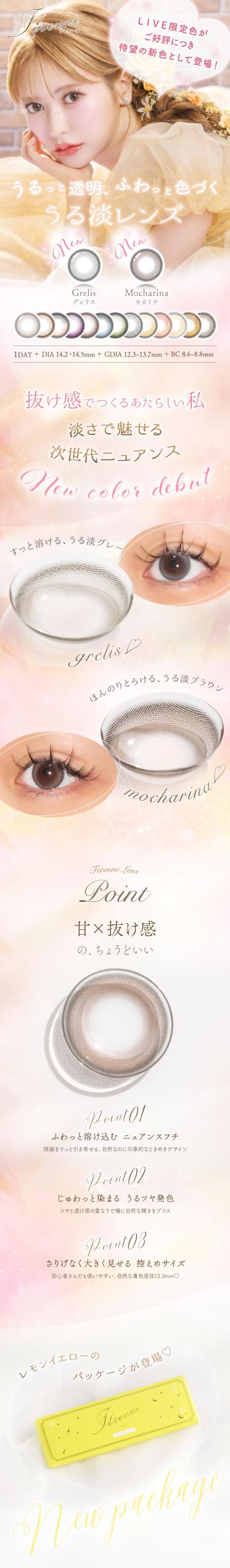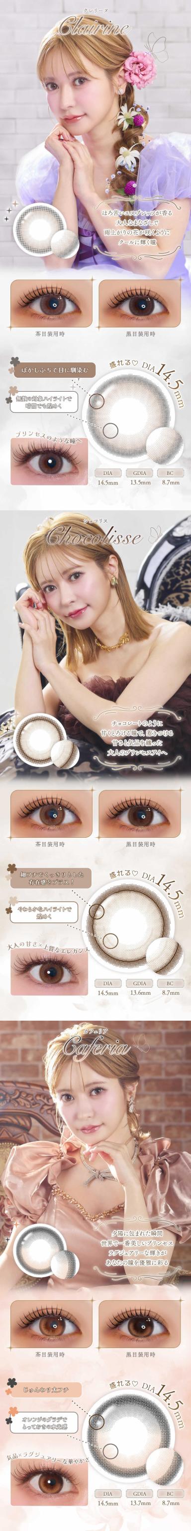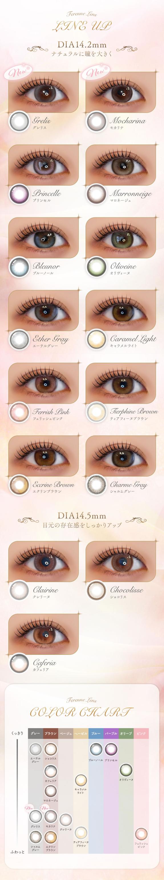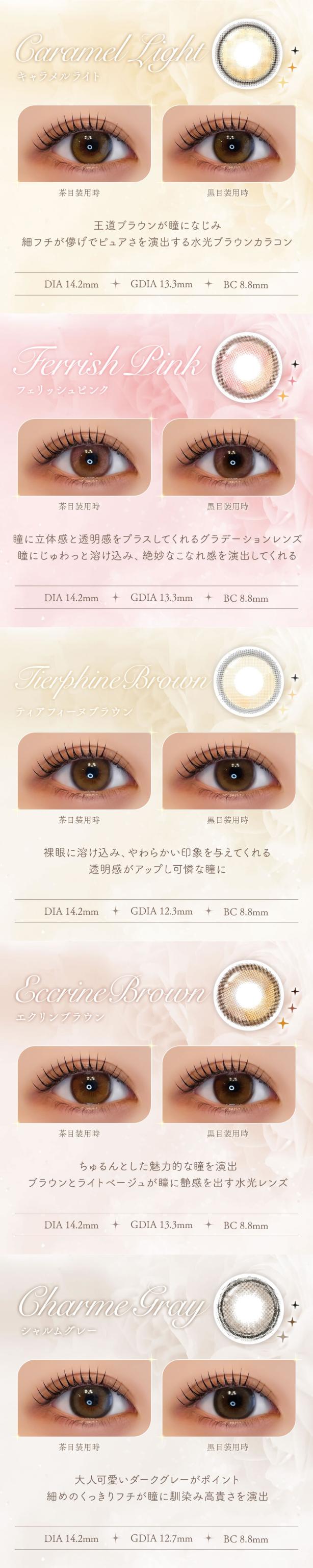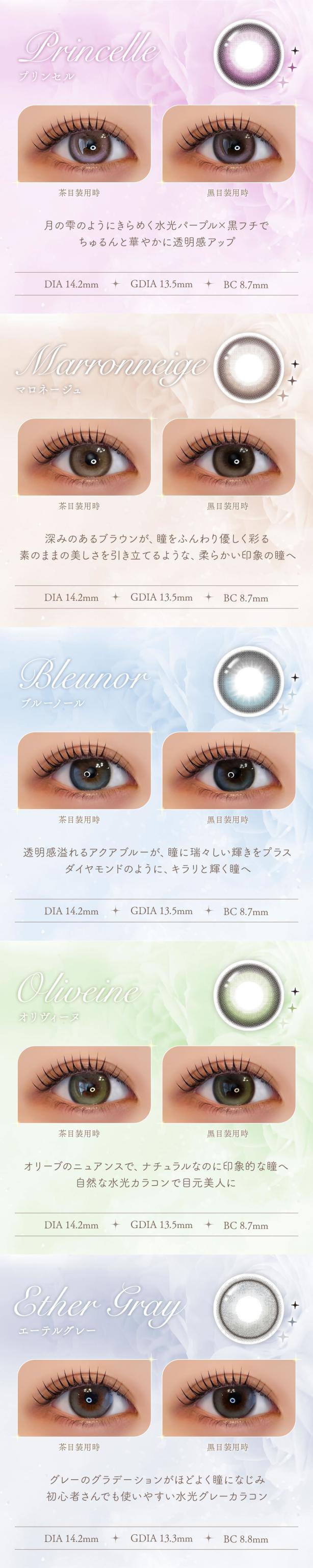 | カラー | プリンセル【1813】 マロネージュ【1814】 ブルーノール【1815】 オリヴィーヌ【1816】 フェリッシュピンク【1436】 ティアフィーヌブラウン【1437】 エクリンブラウン【1438】 シャルムグレー【1439】 キャラメルライト【1642】 エーテルグレー【1643】 カフェリア【1985】 クレリーヌ【1986】 ショコリス【1987】 モカリナ【1983】 グレリス【1984】 |