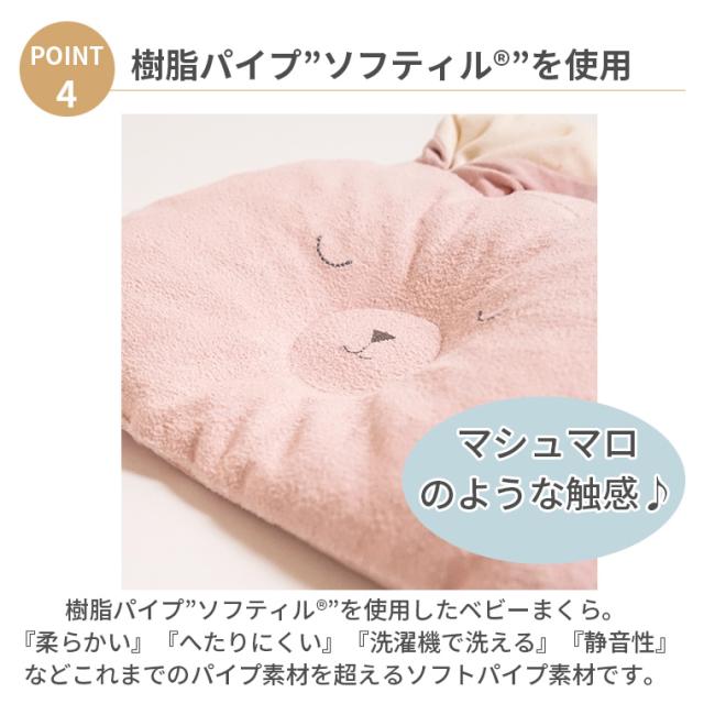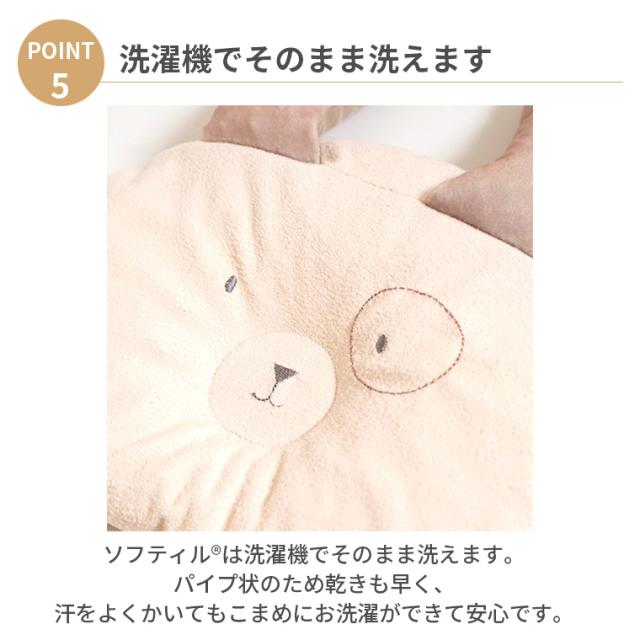 特殊な面テープ生地を使用することで、動物の耳がまくら本体にくっつくため、赤ちゃんの寝ている間の激しい動きにも強いです。