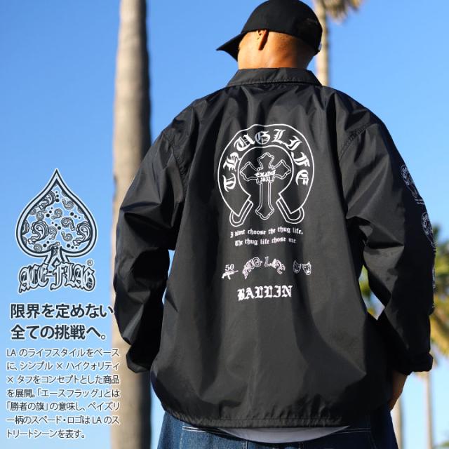 【50%OFF】ACE FLAG アウター 長袖 コーチジャケット ブルゾン メンズ 黒 大きいサイズ エースフラッグ ナイロンジャケット ジャケット ライトアウター ThugLife サグライフ 馬蹄 袖ロゴ b系 ヒップホップ ストリート系 ハイ 服 AF-TL-OU-009