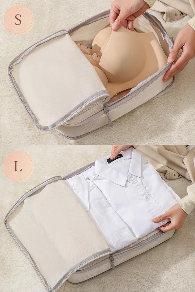 畳んだ衣類を収納し、ファスナーを閉めるだけで手軽に圧縮できる、安心のトラベルポーチ。