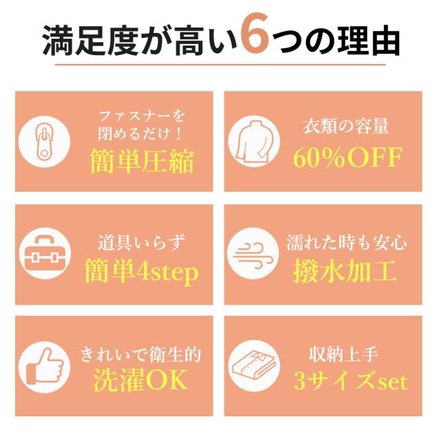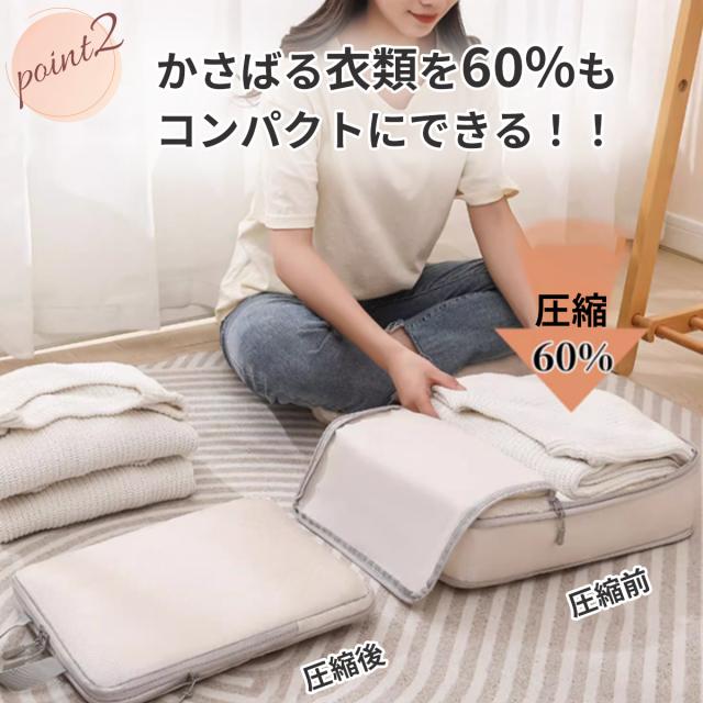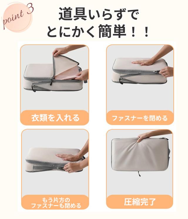 掃除機などの道具不要!ファスナーを閉めるだけで、約60%ものスペースを節約してコンパクトに収納できます。