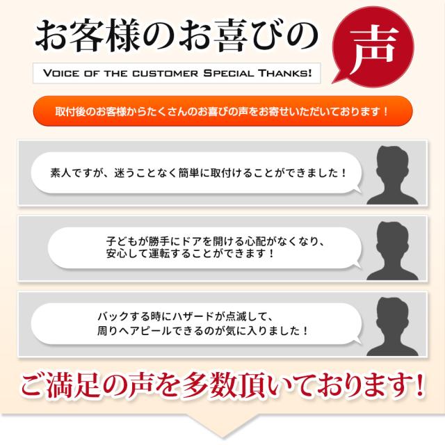 ■ OBDを使用した車載アクセサリを搭載しているお車にはご使用できませんのでご注意ください。 ■ドアオープンハザード点滅時にエンジンをOFF状態にすると、約15秒程度ハザードが点滅し続けます。こちらの動作は商品の仕様ですので、故障や不具合ではありません。 ■ハザード点滅時に一瞬もたつく事がありますが、ご使用上は問題ありませんのでご安心してお使いください。 ■ハザードの自動点滅は約1分間経過すると自動で停止します。 ■ グレードやオプション等により装着できないことがございます。必ずお客様のお車を確認の上ご購入ください。 ■ 一部車種やグレード、お取り付けの社外品との干渉などにより、予期しないトラブルが発生する可能性がございます。 |