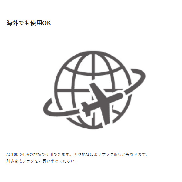 AC100-240Vの地域で使用できます。国や地域によりプラグ形状が異なります。