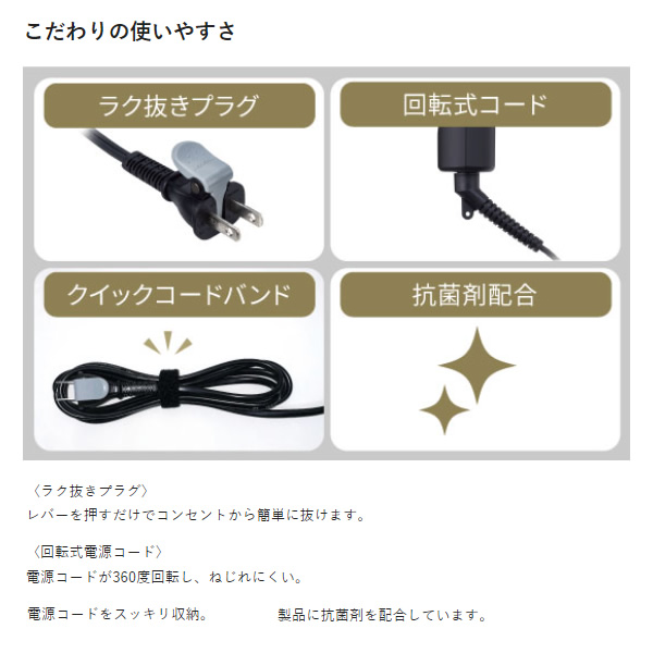 電源コードが360度回転し、ねじれにくい。