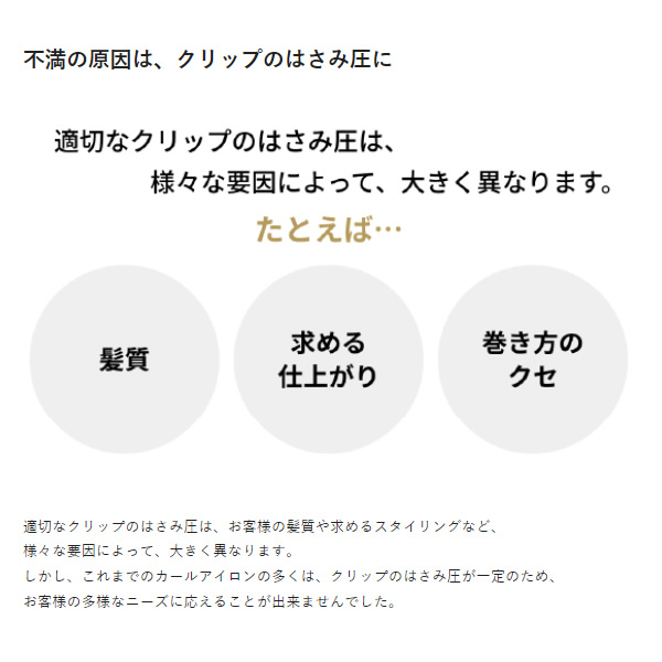 しかし、これまでのカールアイロンの多くは、クリップのはさみ圧が一定のため、