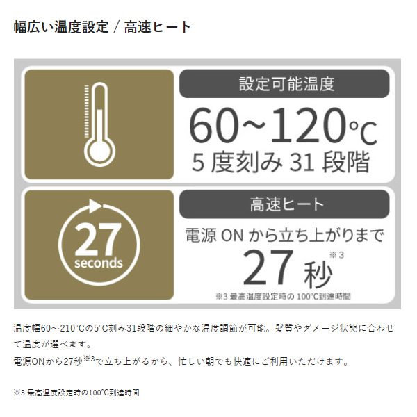 温度幅60〜210℃の5℃刻み31段階の細やかな温度調節が可能。髪質やダメージ状態に合わせて温度が選べます。
