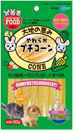 チンチラが大好きな芯まで食べられる柔らかさが特徴の若いトウモロコシです。 便臭を緩和する穀物発酵エキスを配合し、豊富な食物繊維が毛玉の形成を抑えます。 包装には保存に便利なチャック付き袋を採用しました。