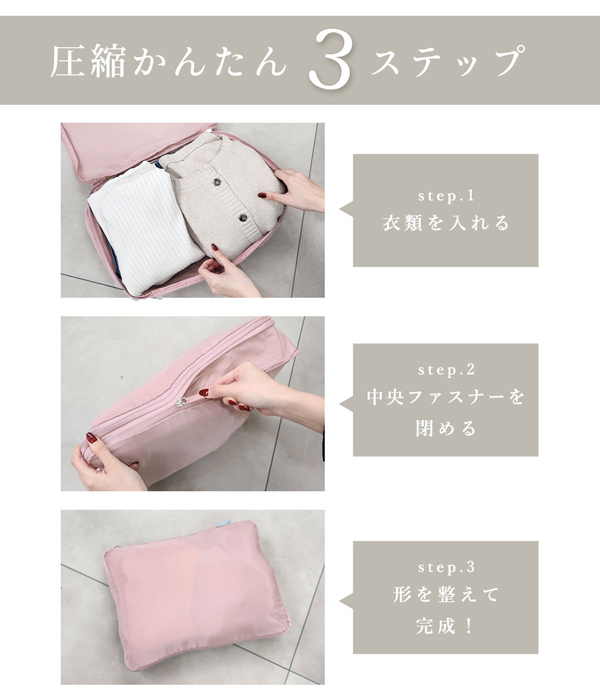 ファスナーを閉めるだけで簡単圧縮できるので、
