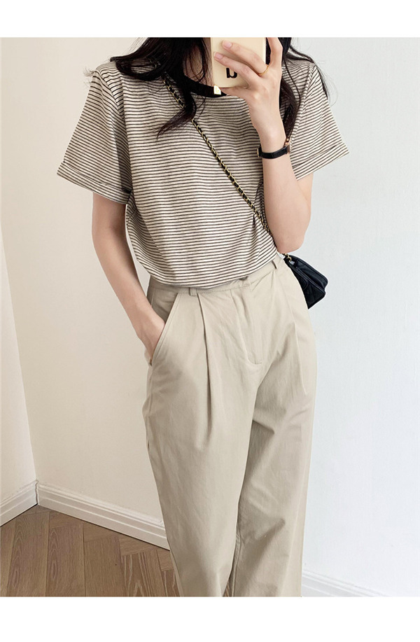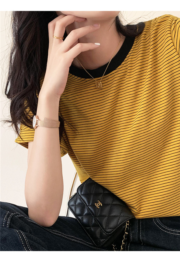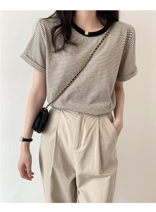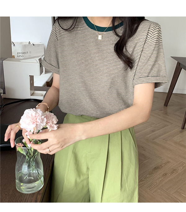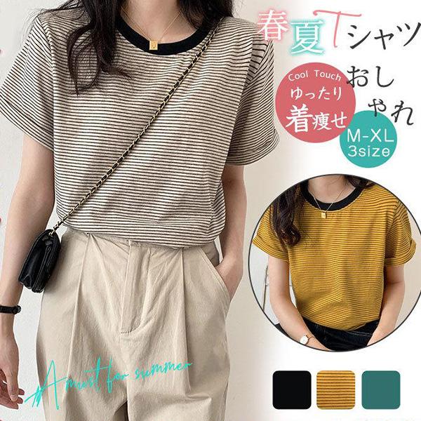 【2点ご購入で300円OFF】Tシャツ 半袖 クルーネック 細ボーダー カットソー 袖折り返し シンプル レイヤード 重ね着 きれいめ カジュアル 春夏 レディース 大人