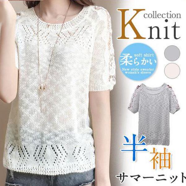 サマーニット 春 夏 レース 半袖 丸首 薄手 花柄 レディース セーター 編み 可愛い 透け 無地 秋 透明 柔らかい ニット トップス おしゃれ