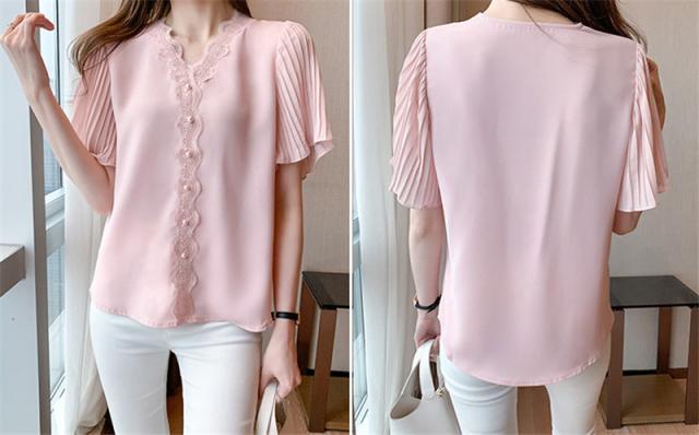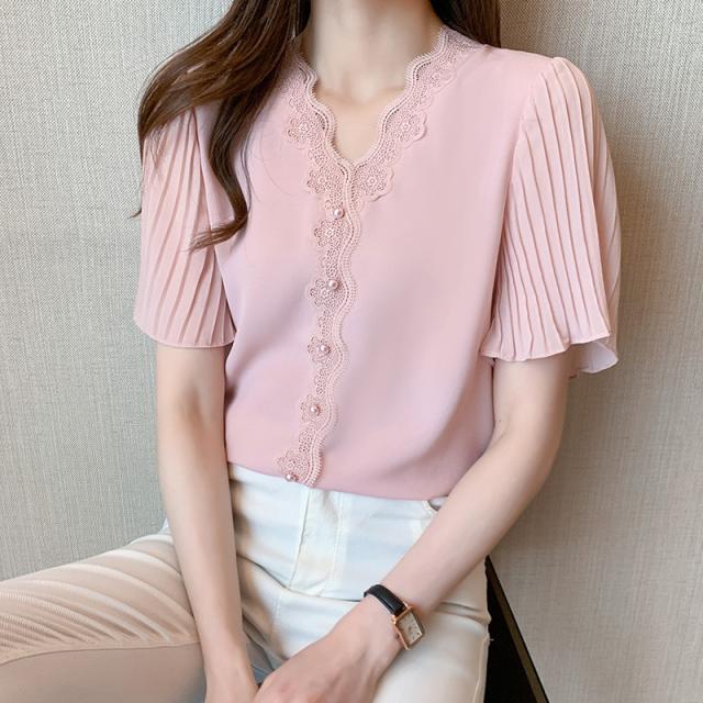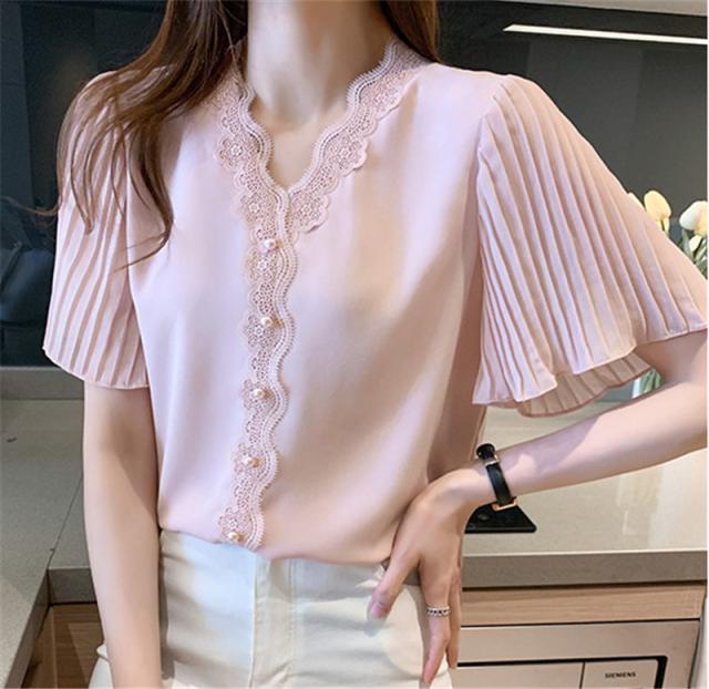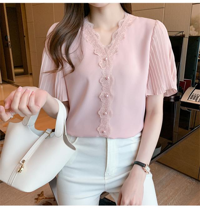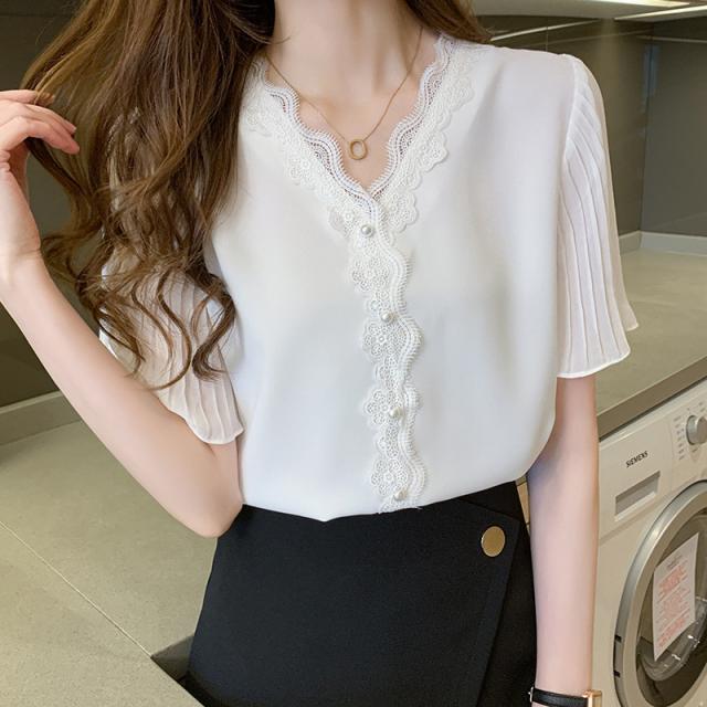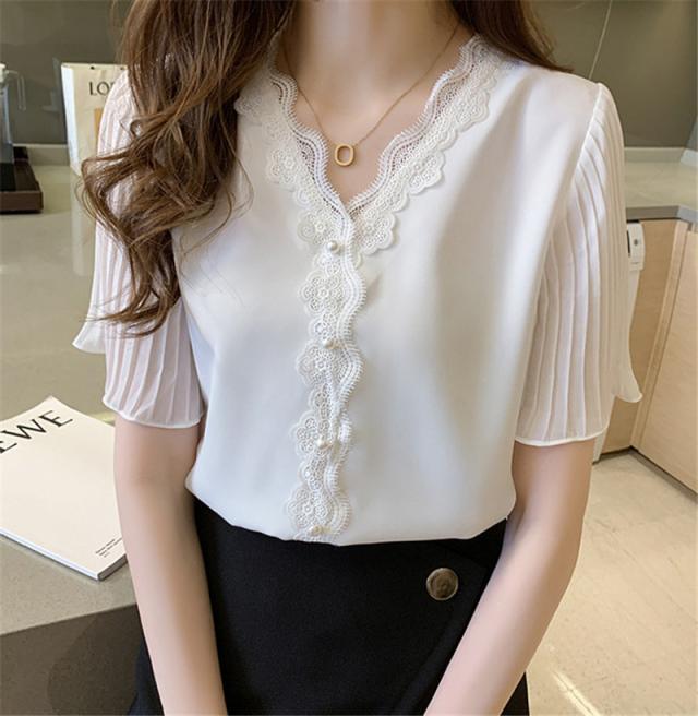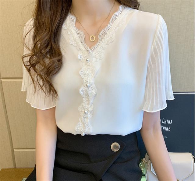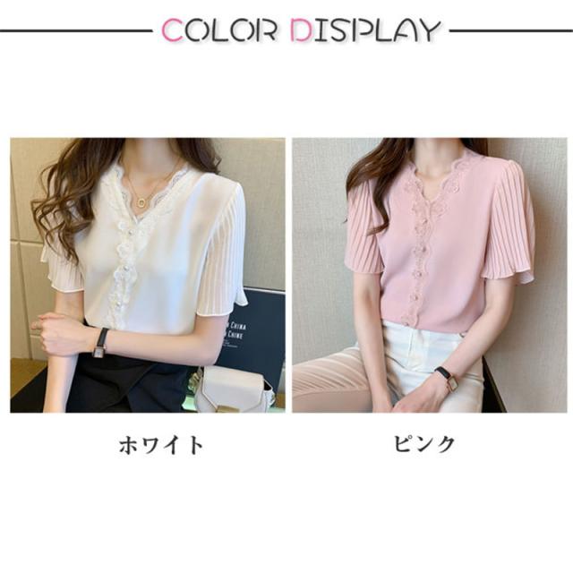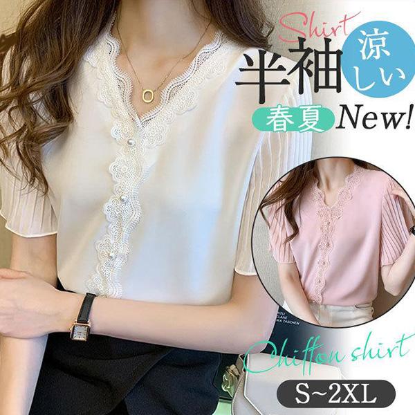 ブラウス レディース 春夏 新作 オシャレブラウス フリル 白シフォンシャツ 半袖トップス レース Vネック 上品 大人 通勤 OL 可愛い 送料無料