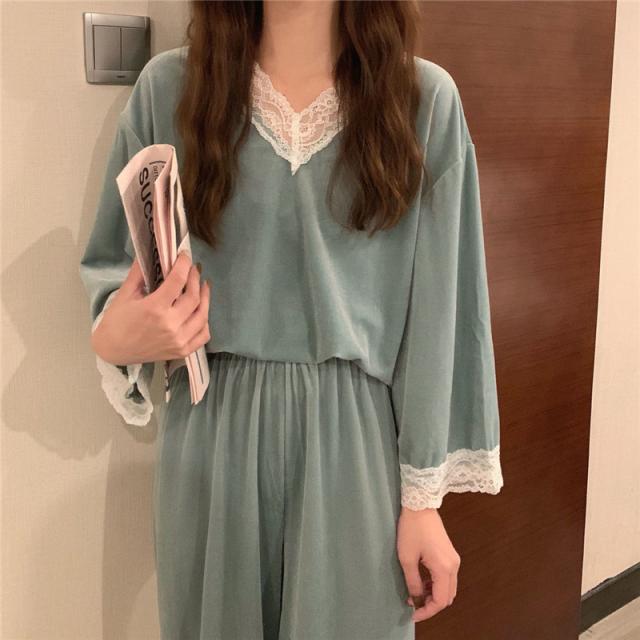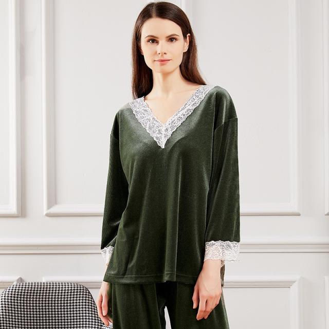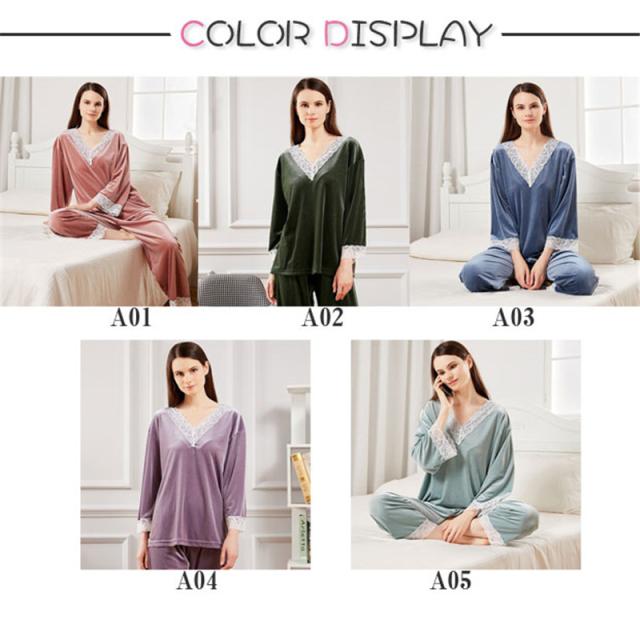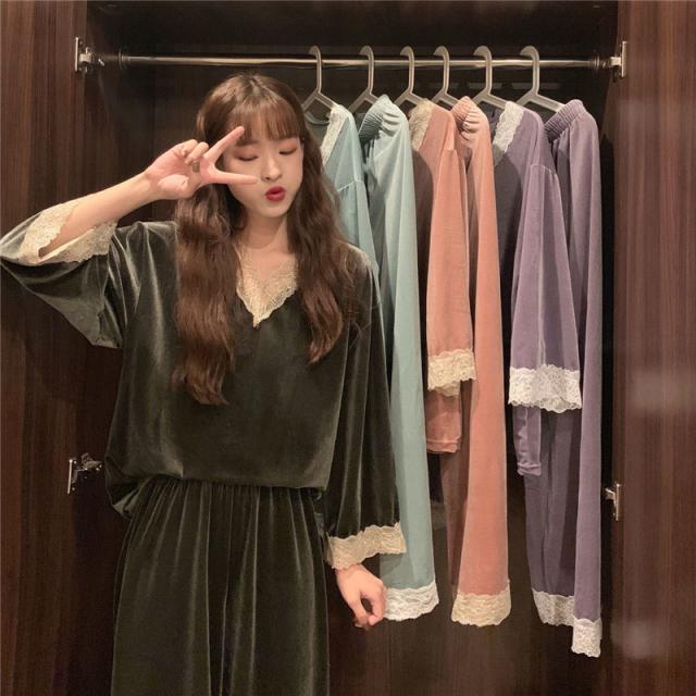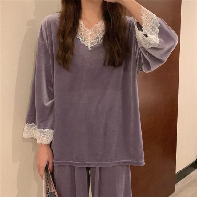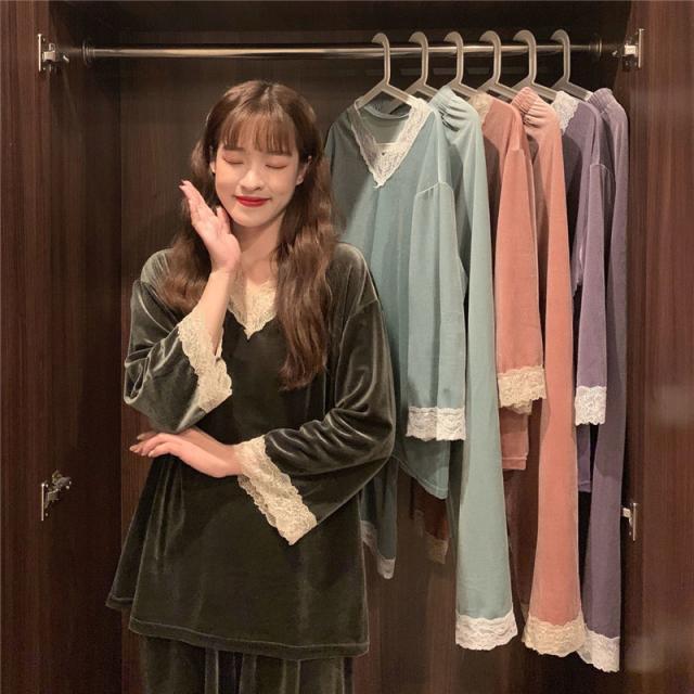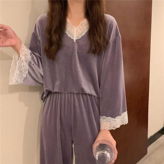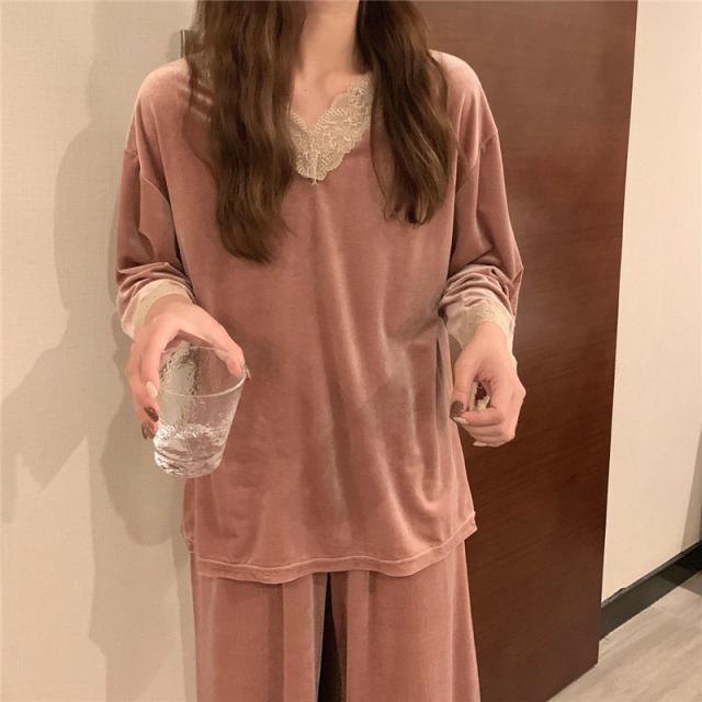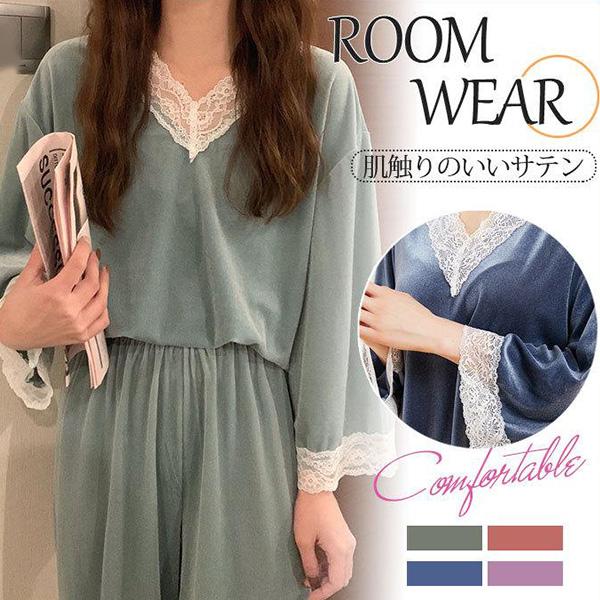 パジャマ モコモコルームウェア レディース 春秋長袖 パジャマ レース Vネック ルームウェア ベルベット 暖かい 上下セット 可愛い 部屋着