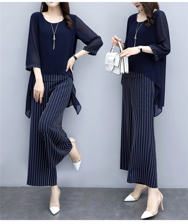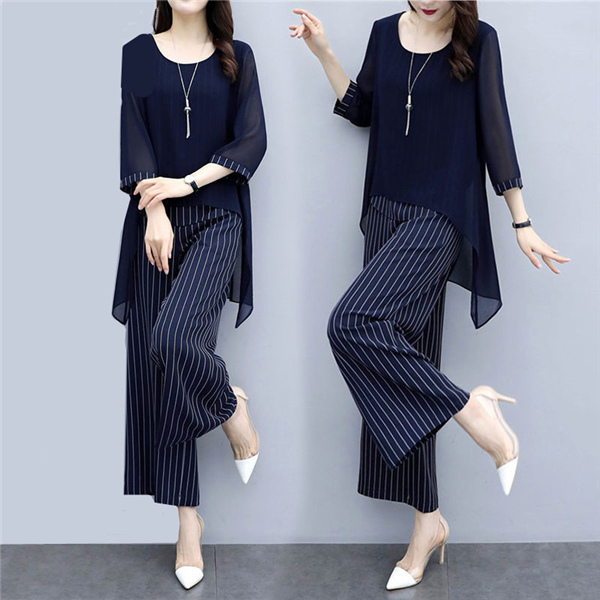 セットアップ レディース カジュアル ストライプ シフォン きれいめ 半袖 2点セット 体型カバー フォーマル 通勤 夏 オシャレ 上品 着痩せ 涼感