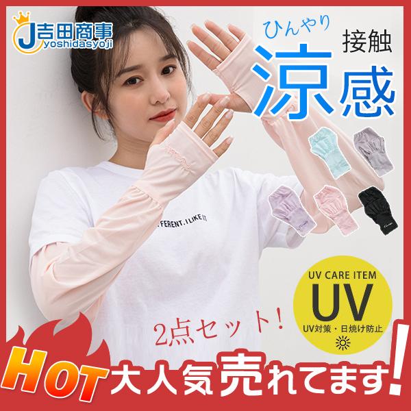 アームカバー UVカット レディース 伸縮性 ゆったり ロング 2点セット 指穴付き 涼感 刺繍 日焼け防止 おしゃれ 接触冷感 涼しい ひんやり
