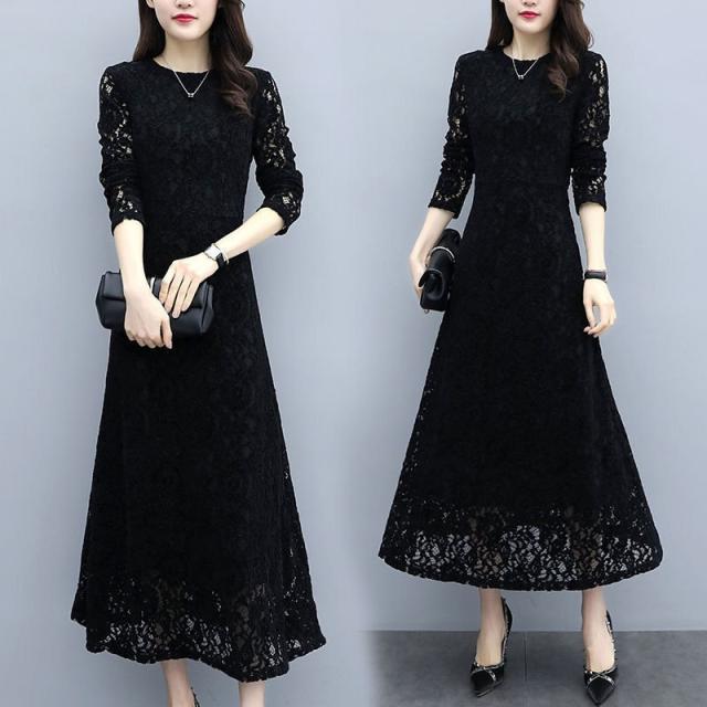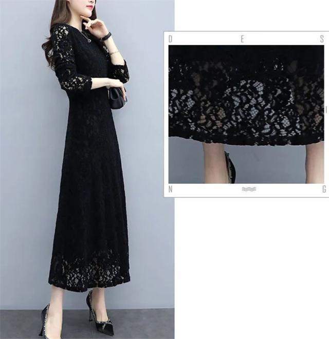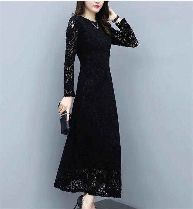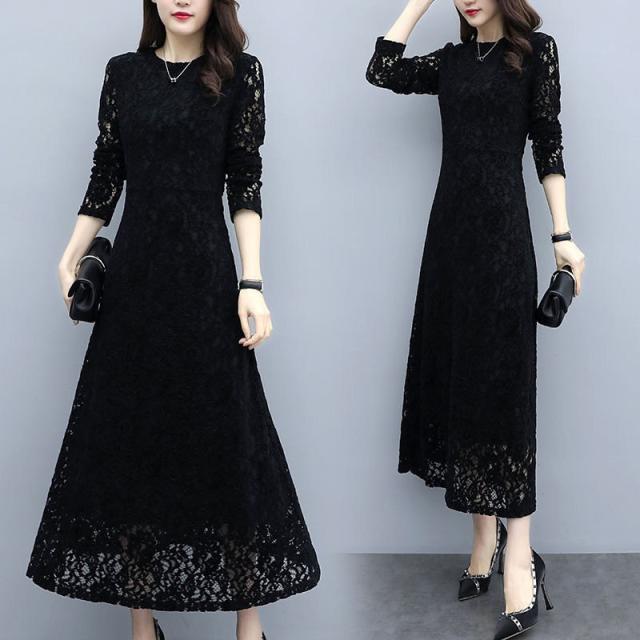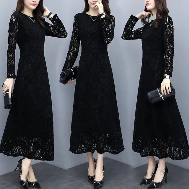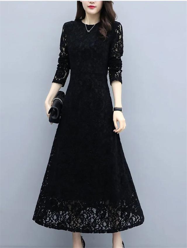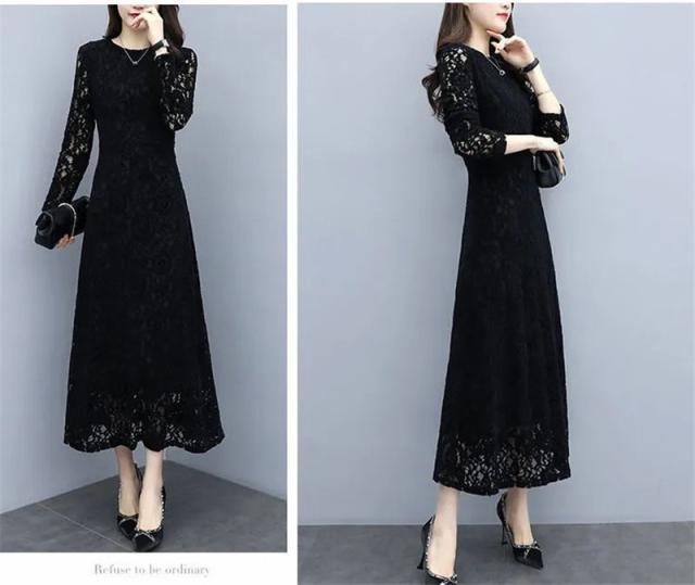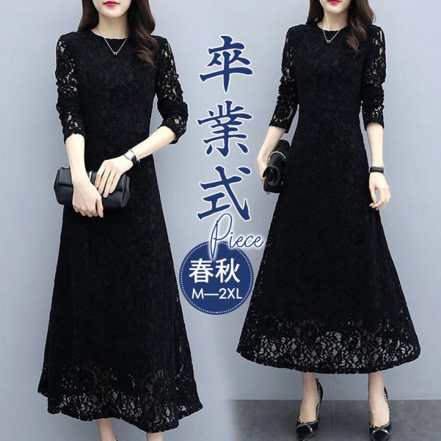 ワンピース レデイース 秋 長袖 ロング丈 総レース Aラインワンピース きれいめ 上品 黒 着痩せ おしゃれ 大人 通勤 二次会 入学式 送料無料