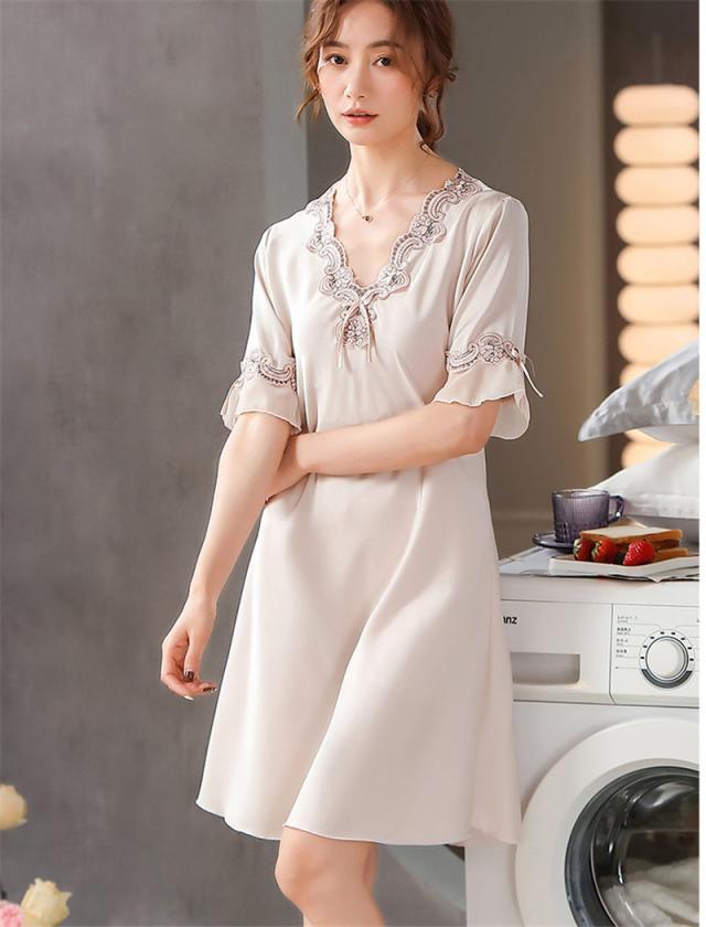 パジャマ レディース ルームウェア 半袖 レース 寝巻き 春夏 ネグリジェ ワンピース シルクタッチ 光沢 寝間着 部屋着 ゆったり 体型カバー