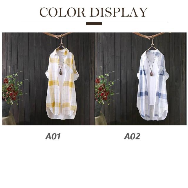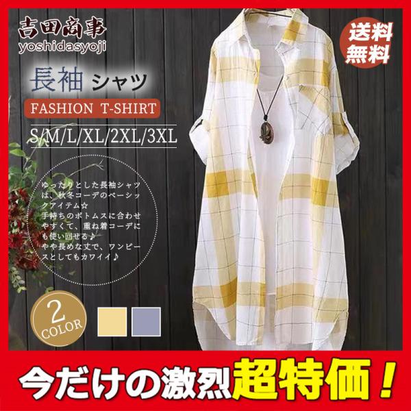 シャツ レディース トップス 長袖 チェック柄 リネン風 ブラウス 柔らかい ロングシャツ 羽織 春秋 体型カバー ワンピース カジュアル おしゃれ