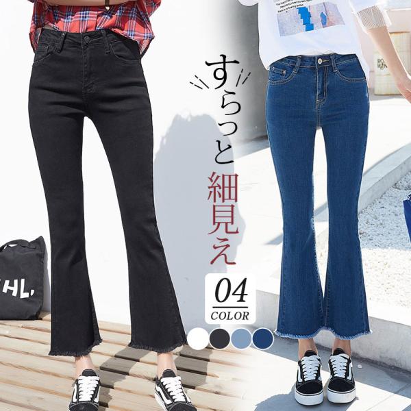 フレアパンツ デニム レディース ジーンズ ズボン 九分丈 ボトムス ハイウエスト ロング丈 カシュアル 体型カバー ゆったり 美脚 春秋 細身