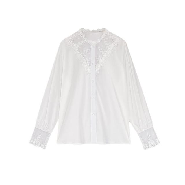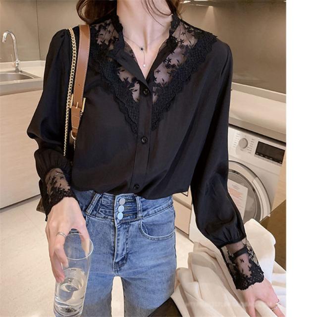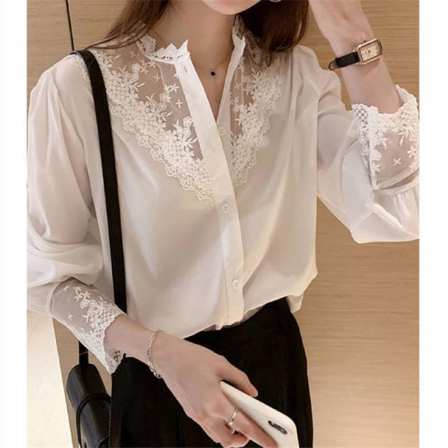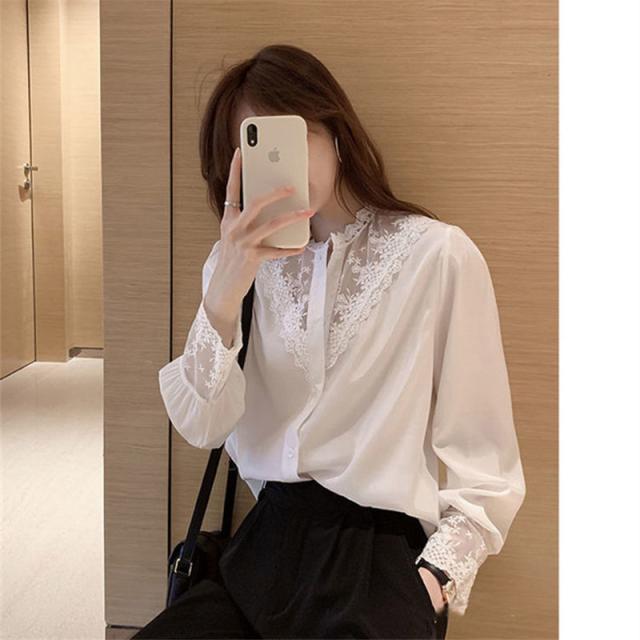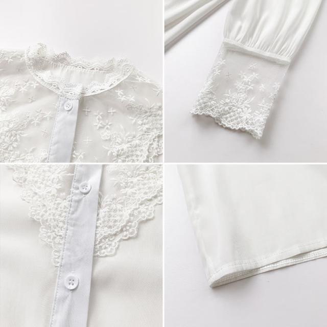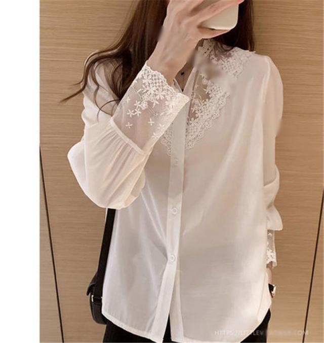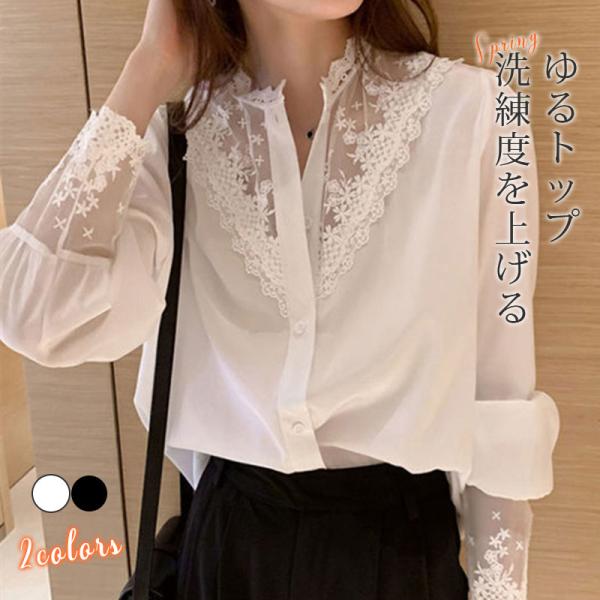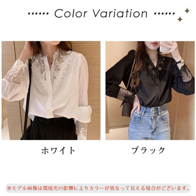 『2個以上購入で400円OFF』シャツブラウス シフォンブラウス レース切り替え 黒 白 長袖 レディース トップス 可愛い 花柄 おしゃれ カジュアル 新品