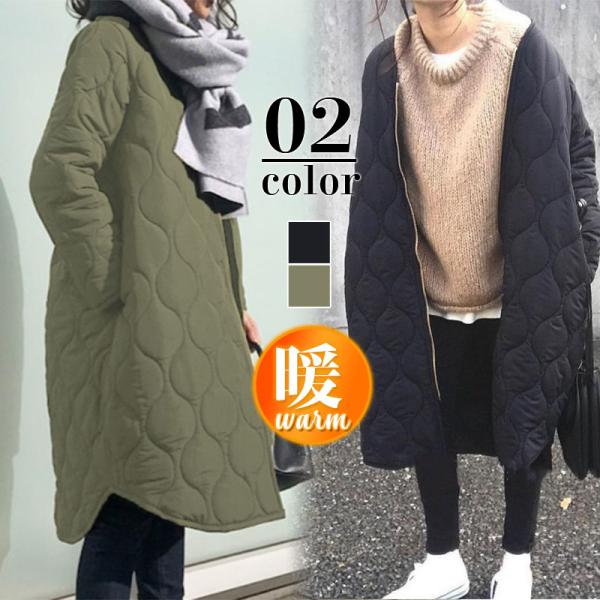 キルティングコート レディース 中綿コート 襟なし ロング丈 キルティング 無地 軽量 大きいサイズ 暖かい アウター あったか ゆったり 秋冬