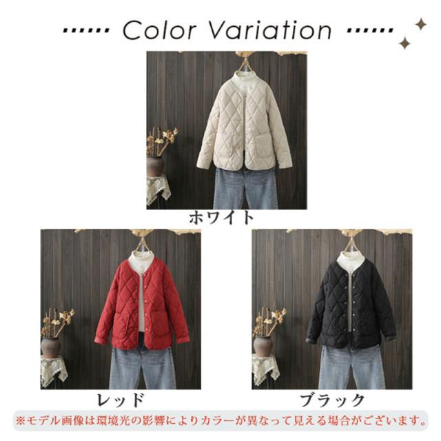 キルティングコート レディース 中綿コート 襟なし ショート丈 長袖 キルティング 無地 軽量 大きいサイズ 暖かい アウター かわいい ゆったり