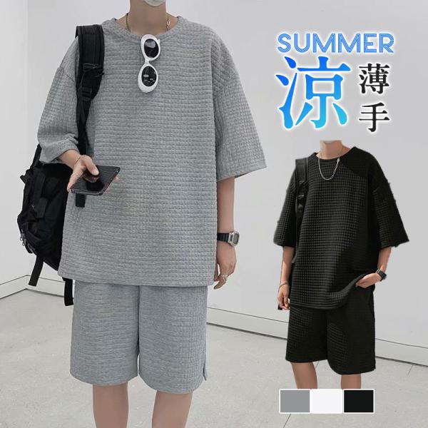 \2点ご購入で15%OFF/上下セット セットアップ メンズ 半袖 スウェット 薄手 ハーフパンツ サルエルパンツ 無地 ルームウェア 部屋着 カジュアル ゆったり
