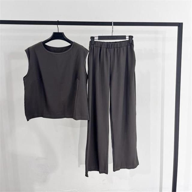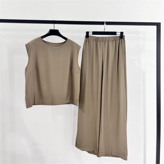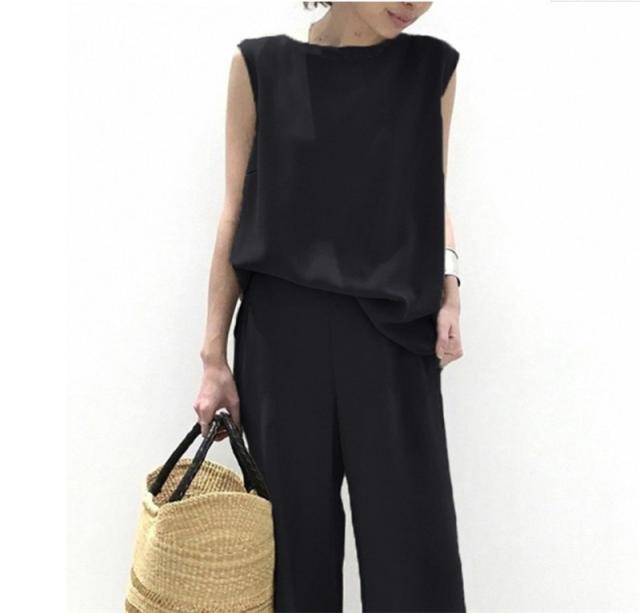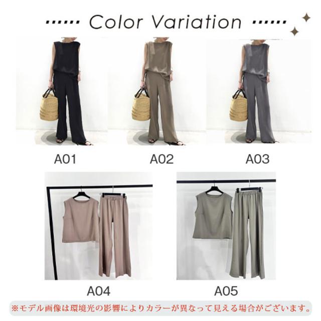 セットアップ レディース 夏 春 Tシャツ ブラウス 袖なし ノースリーブ カジュアル ワイドパンツ 無地 きれいめ ロングパンツ 体型カバー 着痩せ