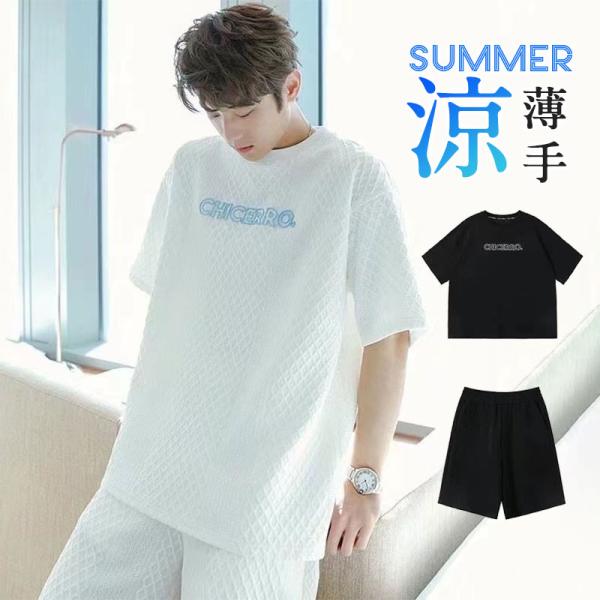 上下セット セットアップ メンズ 半袖 スウェット 薄手 ハーフパンツ 総柄 英字 ルームウェア 部屋着 カジュアル ゆったり かっこいい プレゼント