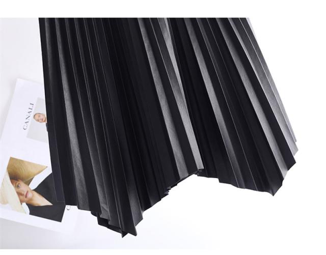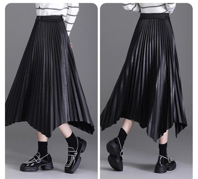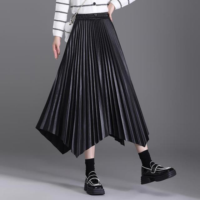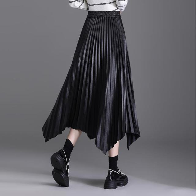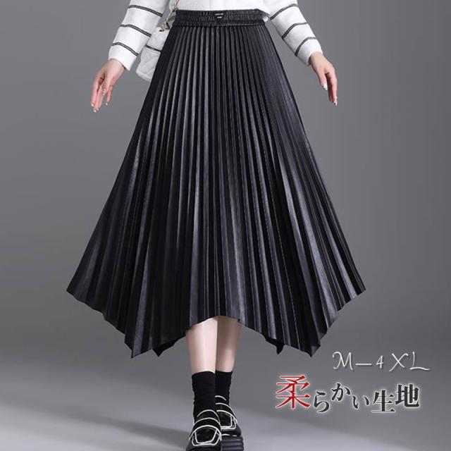 レザースカート レディース プリ?ツ ミモレ丈 ウエストゴム フェイクレザー ブラック フレア ハイウエスト おしゃれ 可愛い 通勤 細見え 送料無料