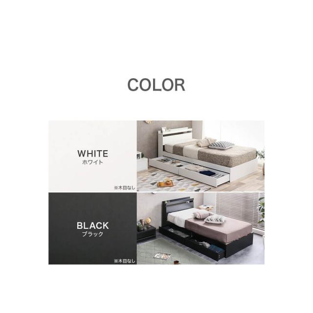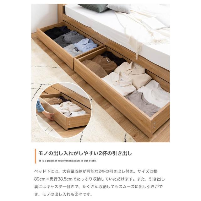 ヘッドボード内寸は幅100cm×奥行14cm×高さ6cm、引き出し内寸は幅89cm×奥行38.5cm×高さ10cmとなっており、これらのスペースを利用して衣類や寝具、書類などを整理整頓。
