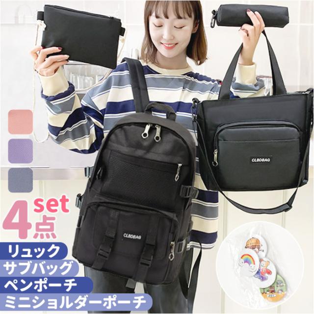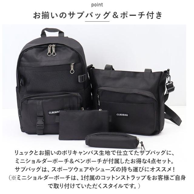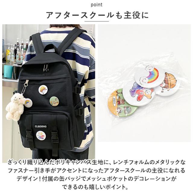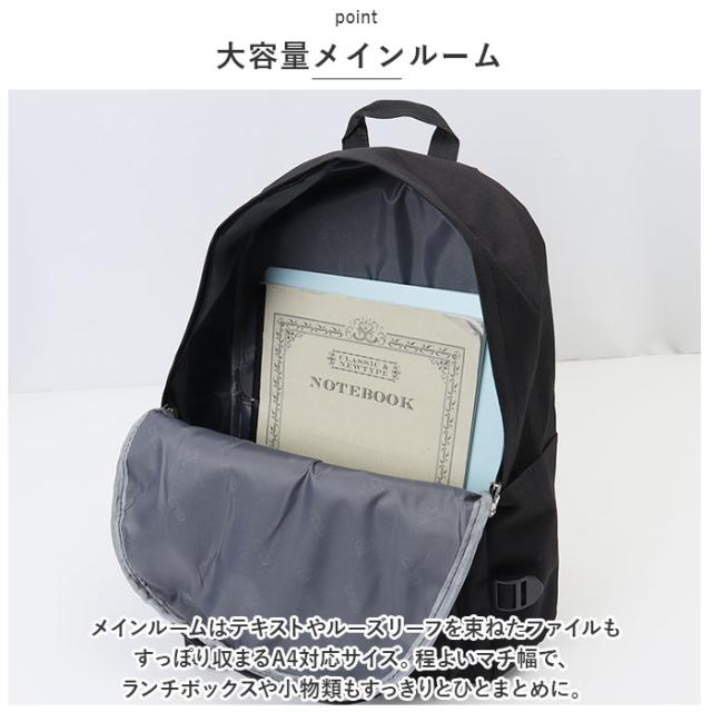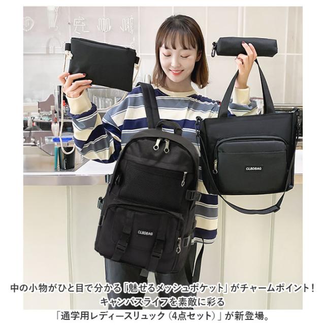| 商品説明 | ・中の小物がひと目で分かる「魅せるメッシュポケット」がチャームポイント!キャンパスライフを素敵に彩る「通学用レディースリュック(4点セット)」が新登場。 【パッキング作業がスムーズ】 ・リュックの開口部は、側面まで大きく開くダブルファスナー仕様。収納した小物がひと目で見渡せて、テキストやペンケースもスムーズにパッキング可能。 【大容量メインルーム】 ・メインルームはテキストやルーズリーフを束ねたファイルもすっぽり収まるA4対応サイズ。程よいマチ幅で、ランチボックスや小物類もすっきりとひとまとめに。 【PCサイズインナーポケット】 ・メインルーム内側に、ノートPCやタブレットの持ち運びに便利なオープンポケットを1ヶ所装備。(※両面クッション仕様ではありません。専用ケースに収めた状態での使用をお奨めいたします。) 【小物にクイックアクセス】 ・リュック前面に「魅せる収納」を叶えるメッシュポケットのほか、スマホや小物がサッと取り出せる収納ポケットをデザインした使い勝手抜群の3ポケット仕様。 【ボトル&アンブレラポケット】 ・外側両サイドに折りたたみ傘や500mlペットボトルが差し込めるオープンポケットを2つ配置。 【形崩れ防止サイドバックル】 ・荷物が少ないときには側面のバックルベルトでマチ幅が調節可能。よりスリムなフォルムにスタイルUP! 【貴重品の携帯時も安心】 ・背面側に、お財布やパスポートなど貴重品が安心して収納できるシークレットポケット付き。 【お揃いのサブバッグ&ポーチ付き】 ・リュックとお揃いのポリキャンバス生地で仕立てたサブバッグに、ミニショルダーポーチ&ペンポーチが付属したお得な4点セット。サブバッグは、スポーツウェアやシューズの持ち運びにオススメ!(※ミニショルダーポーチは、付属のコットンストラップをお客様ご自身で取り付けていただくスタイルです。) |