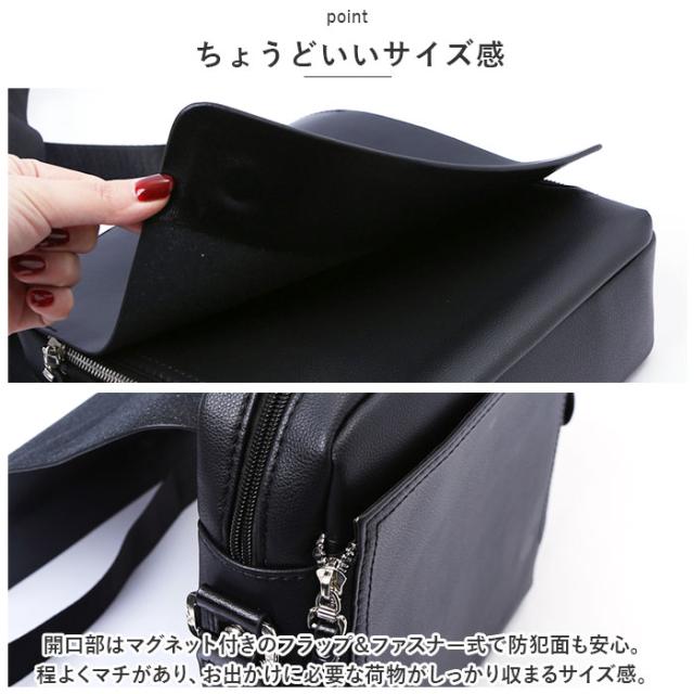 | 商品説明 | ・普段使いにピッタリなショルダーバッグが発売。 【ちょうどいいサイズ感】 ・開口部はマグネット付きのフラップ&ファスナー式で防犯面も安心。程よくマチがあり、お出かけに必要な荷物がしっかり収まるサイズ感。 【便利なポケット】 ・内側や外側にポケットを複数配置しているので、サッと取り出したい小物の収納に便利。前面のオープンポケットには両サイドにファスナーが付いていて、荷物の幅に合わせて調節可能。 【撥水加工】 ・撥水加工を施した合皮素材を使用しているので、雨の日のお出かけも安心。 【ショルダーベルト】 ・ショルダーベルトは幅広タイプで肩に負担がかかりにくく、お好みの長さに調節OK。 ・斜め掛け・肩掛け両方のスタイルで使用可能。 【シンプルなデザイン】 ・デイリーユースはもちろん、ビジネスシーンでも使いやすいシンプルでスタイリッシュなデザイン。 【ポケット仕様】 ・内側:ファスナーポケット×1、オープンポケット×1 ・前面:オープンポケット×1、内側:カードポケット×1 ・背面:ファスナーポケット×1 |