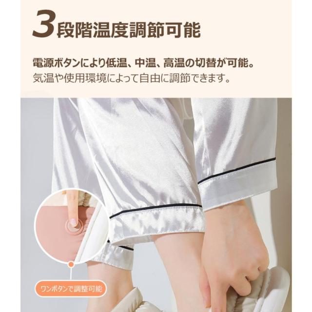 【3段階温度調節可能】足元の電源ボタンを3秒長押しすると、ONで赤色が点灯。ボタンを押して強(赤)→中(白)→弱(青)へとお好みの温度設定ができます。色で温度設定状況が一目瞭然、とても便利です。(赤(55℃)約3時間継続可能・白(45℃)約4.5時間継続可能・青(35℃)約6時間継続可能)※メジャー採寸の為、サイズが多少異なる場合がございます。予めご了承ください。