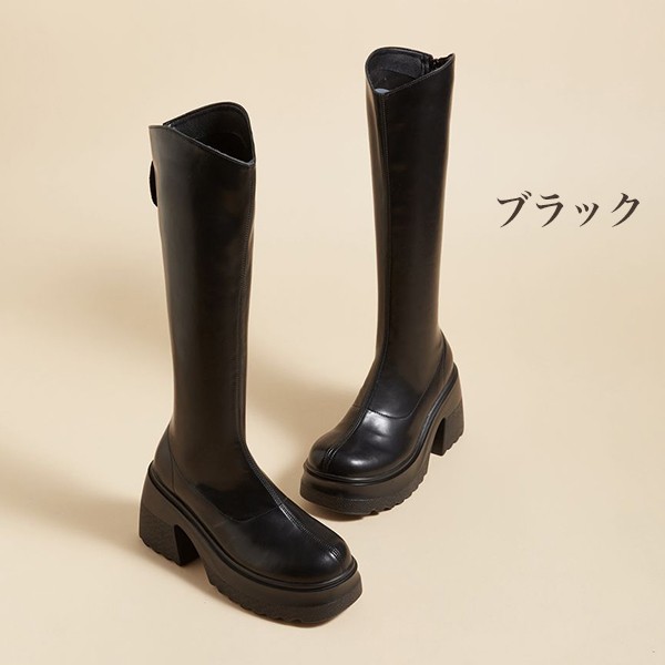 ロングブーツ ブーツ レディース PU 着痩せ効果 太いヒール 厚底 美脚 防寒 秋 冬 可愛い フェミニン ガーリー きれいめ 通勤 ブラック アイボリー ブラウン