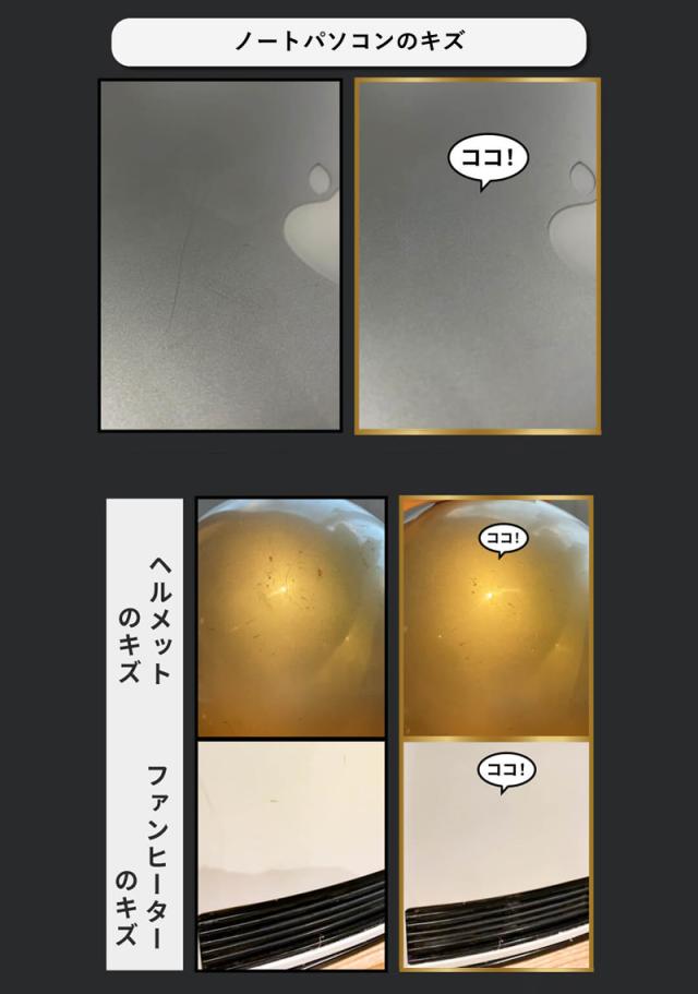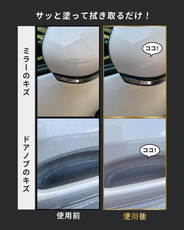 成分中の透明な微粒の樹脂によりキズを埋め、自動車のボディカラーに関係なく、クリア層の小キズや擦りキズを目立たなくさせます。