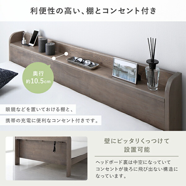 眼鏡などを置いておける棚と、携帯の充電に便利なコンセント付きです。