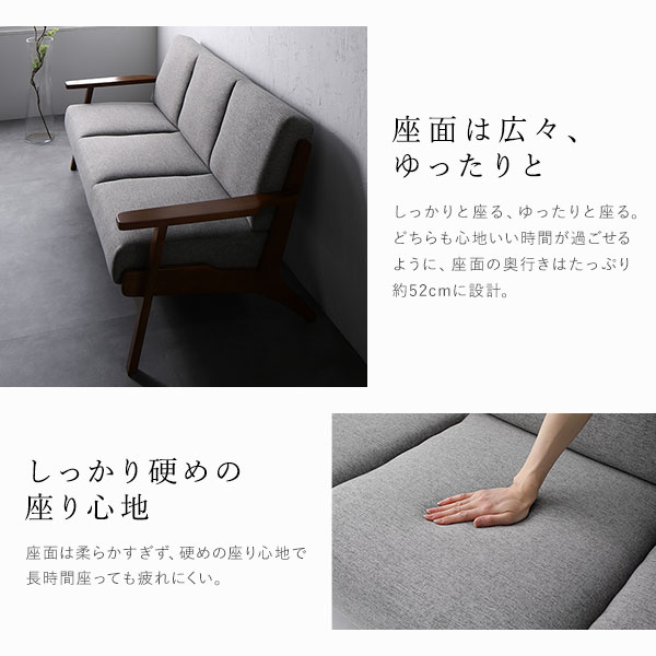【サイズ(約)】 1人掛け:幅71cm×奥行77cm×高さ75cm(座面の高さ:40cm、背もたれの高さ:40cm) 2人掛け:幅133cm×奥行77cm×高さ75cm(座面の高さ:40cm、背もたれの高さ:40cm) 3人掛け:幅164.5cm×奥行77cm×高さ75cm(座面の高さ:40cm、背もたれの高さ:40cm) ※サイズは概算になります。 【材質】 ウレタンフォーム、ポリエステル、Sバネ、天然木、合板 【生産国】 中国 【梱包サイズ(約)】2梱包 1人掛け:(1)幅53cm×奥行63cm×高さ28cm、(2)幅73×奥行69×高さ13cm 2人掛け:(1)幅110cm×奥行63cm×高さ28cm、(2)幅73×奥行69×高さ13cm 3人掛け:(1)幅148cm×奥行63cm×高さ28cm、(2)幅73×奥行6...