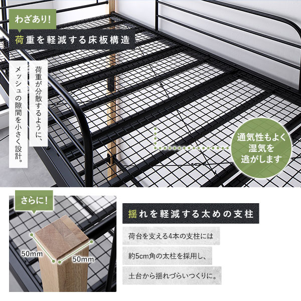荷台を支える4本の支柱には約5cm角の太柱を採用し、土台から揺れづらいつくりに。